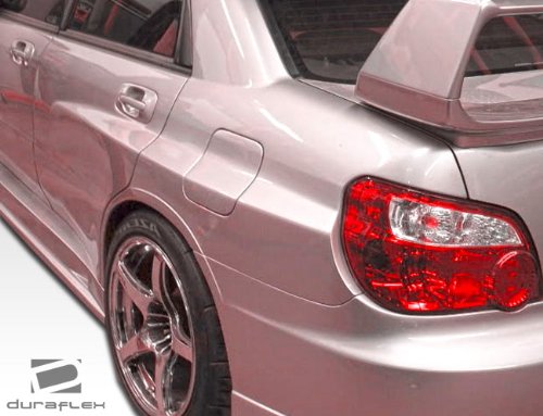 Duraflex FRP Subaru Impreza WRX STI 4DR GT500 Wide Body Rear Fender Flares 3pc > 2006-2007 . Extreme Dimensions has revolutionized fiberglass marketing with their premium Duraflex aerodynamics. Duraflex is not flexible like urethane or plastic bumpers. Duraflex fiberglass combines fiberglass, plastic, and flex resins to obtain its unique features. Because of these features, Duraflex technology obtains a durability rate than the average fiberglass product, resulting in reduced shipping damages. Duraflex products come complete with a black primer finish, high quality mesh grille if applicable, generic hardware kit, and a basic guide to help you install the product. This revolutionary product allows the consumer to receive a premium fiberglass product at an affordable price. All fiberglass parts require modification, shaving, sanding, drilling, filling in order to ensure proper fitment.FeaturesHigh quality 6 oz. fiberglassProfessional prep work requiredCutting, Shaving, Filling required on FRP partsBlack primer finishHigh quality mesh grilleInstallation GuideGeneric Hardware Kit (most parts)Reduced damage rate up to 75%DISCLAIMER: Due to differences in products and design, durability test results may vary.