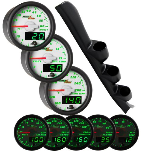 White MaxTow 88-94 Chevy Full Size Gauge Package White Face Boost, EGT & Trans Temp MaxTow's 88-94 Chevy Full Size Truck Custom Gauge Package allows you to easily monitor your truck's vital functions while keeping your dashboard free from obstructions, and will integrate perfectly with your vehicle. Vehicle Specific Gauge Pod The included quad A-pillar pod is specifically designed for the 88-94 Chevy Full Size Truck. This pod holds three 52mm (2 1/16th inch) gauges and is crafted from the highest quality ABS plastic allowing it to be easily installed to your existing A-pillar give you a custom fit and finish. Gauges Included This White MaxTow gauge package features a 60 PSI boost gauge with 6 feet of boost hose and brass compression fittings, a 1500 EGT gauge that includes an exhaust temperature probe with 6 feet of steel braided cable, as well as a transmission temperature gauge with temperature sensor all in our Double Vision® gauge series. These 52mm (2 1/16th inch) gauges will give you the classic look of an analog gauge while also giving you an easy to read green digital numerical readout. This gauge series also gives you multiple dimming options allowing you to your set your preferences when hitting the road during the day or the late hours of the night, and the included brightness recall function will remember the brightness setting you had on before powering your vehicle down so you won't have to reset it every time you turn your vehicle on. Ease of Install This White MaxTow gauge package comes complete with all hardware, sending units, probes, adapters, and fittings required to install your new gauges and pillar pod. All gauges include a 3 foot power wire and a 9 foot sensor wire, assuring that you will have more than enough wire for your installation. Lifetime Support MaxTow includes a one year limited warranty and lifetime technical support with every custom gauge package.